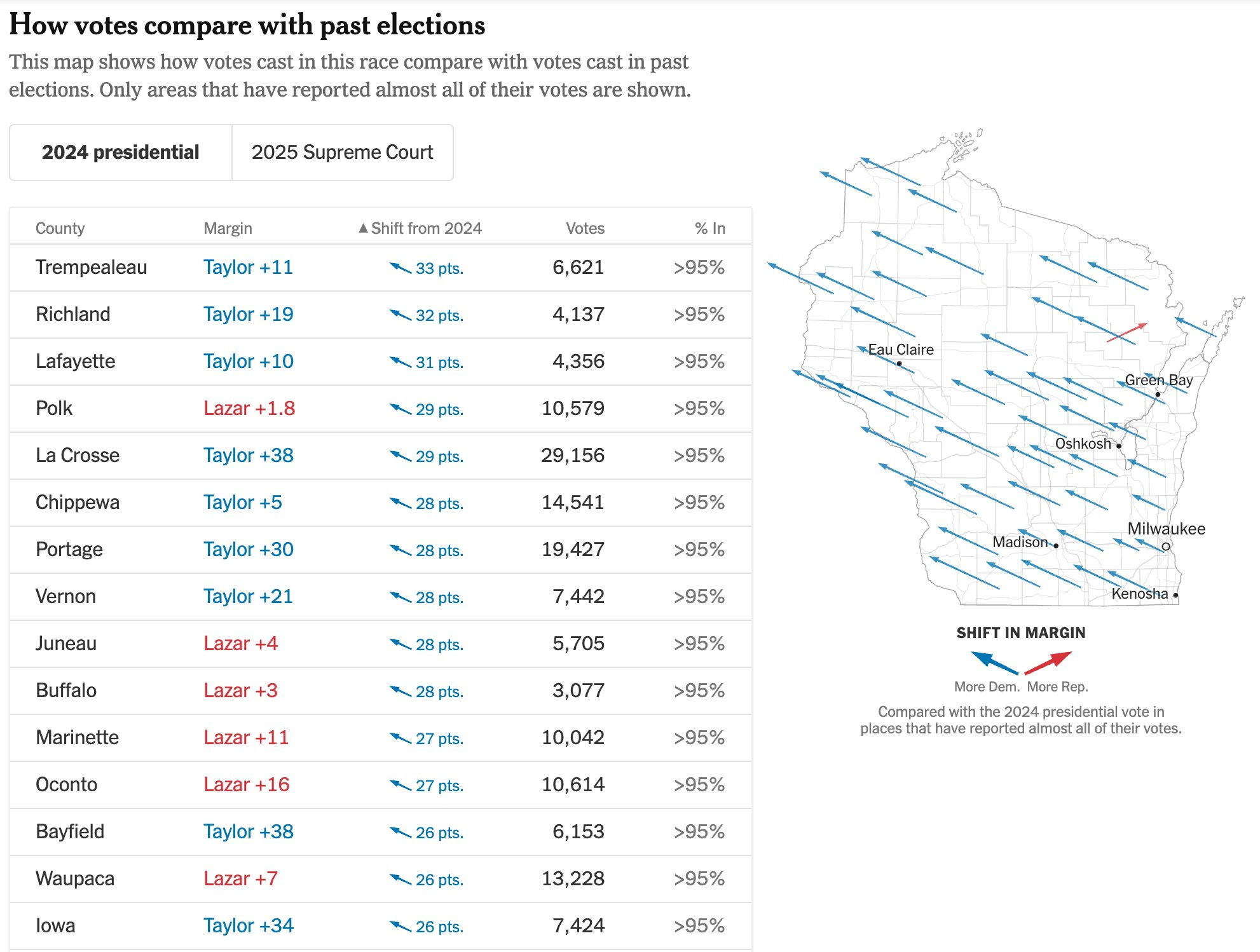 Digging down a bit, the demographic shifts carry ominous signs for Republicans. Nate Cohn writes: “Liberal candidates have fared well in Wisconsin Supreme Court elections in recent years, but Chris Taylor’s victory tonight was even bigger. She swept many reliably Republican working class areas — and might even crack the traditionally conservative suburban counties around Milwaukee.” Democrats are also noting that 12 counties that went red in 2025’s election swung blue last night.