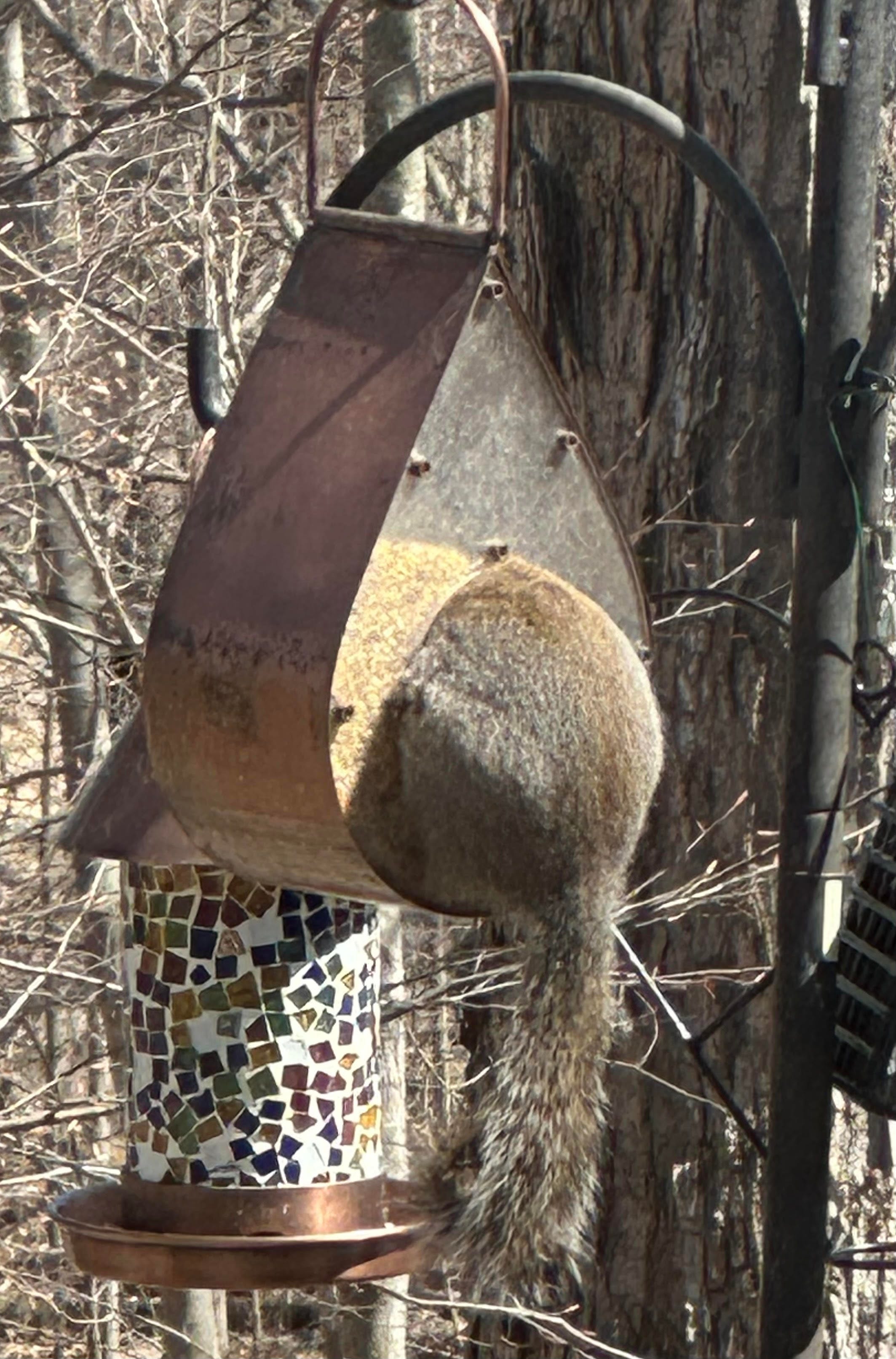 Squirrel butt in bird feeder. I was actually worried that he/she got stuck, but when I yelled, ‘Hey, fat squirrel,” he/she shot out of the feeder and headed for the nearest tree.
