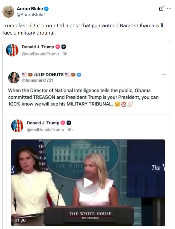 Meanwhile, he posted a demand that a military tribunal to try Barack Obama for TREASON.