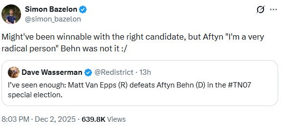 That is surely the case in Tennessee’s 7th congressional district, where Democratic Socialist state legislator Aftyn Behn just lost a high-profile race in a district Donald Trump won by 22 points.