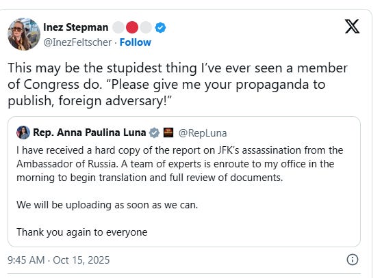 Florida Congresswoman Ana Paulina Luna just did something that would have ended careers a decade ago: she publicly solicited documents from the Kremlin, received them from Russia’s ambassador, thanked Moscow on Twitter, and promised to publish whatever they handed her. No CIA vetting. No intelligence community review. Just a direct pipeline from Putin’s regime into the U.S. Congress….Luna announced she received a 350-page Soviet-era report on the JFK assassination directly from Russia’s ambassador to Washington. She called it “of massive historical significance” and promised translation and public release after “expert review.” Within hours, Kirill Dmitriev—Putin’s economic envoy who was investigated during the Mueller probe—amplified her statement as evidence of “productive U.S.-Russia dialogue.”