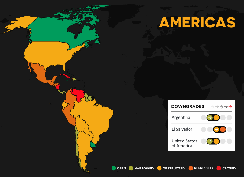 CIVICUS, an international network of civil society groups that advocates for stronger civil liberties, downgraded its assessment of U.S. civic freedoms from “narrowed” to “obstructed” in a new report on Tuesday, months after it added the country to a global human rights watchlist earlier this year.
