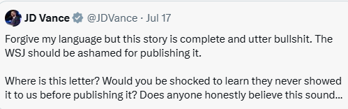 Whatever the pundits thought about the birthday card, Donald J. Trump clearly thought it was very much a BFD. Trump was so concerned about this story that he personally called Rupert Murdoch and the WSJ’s editor, Emma Tucker, to get it killed. (The good news? They didn’t blink.)