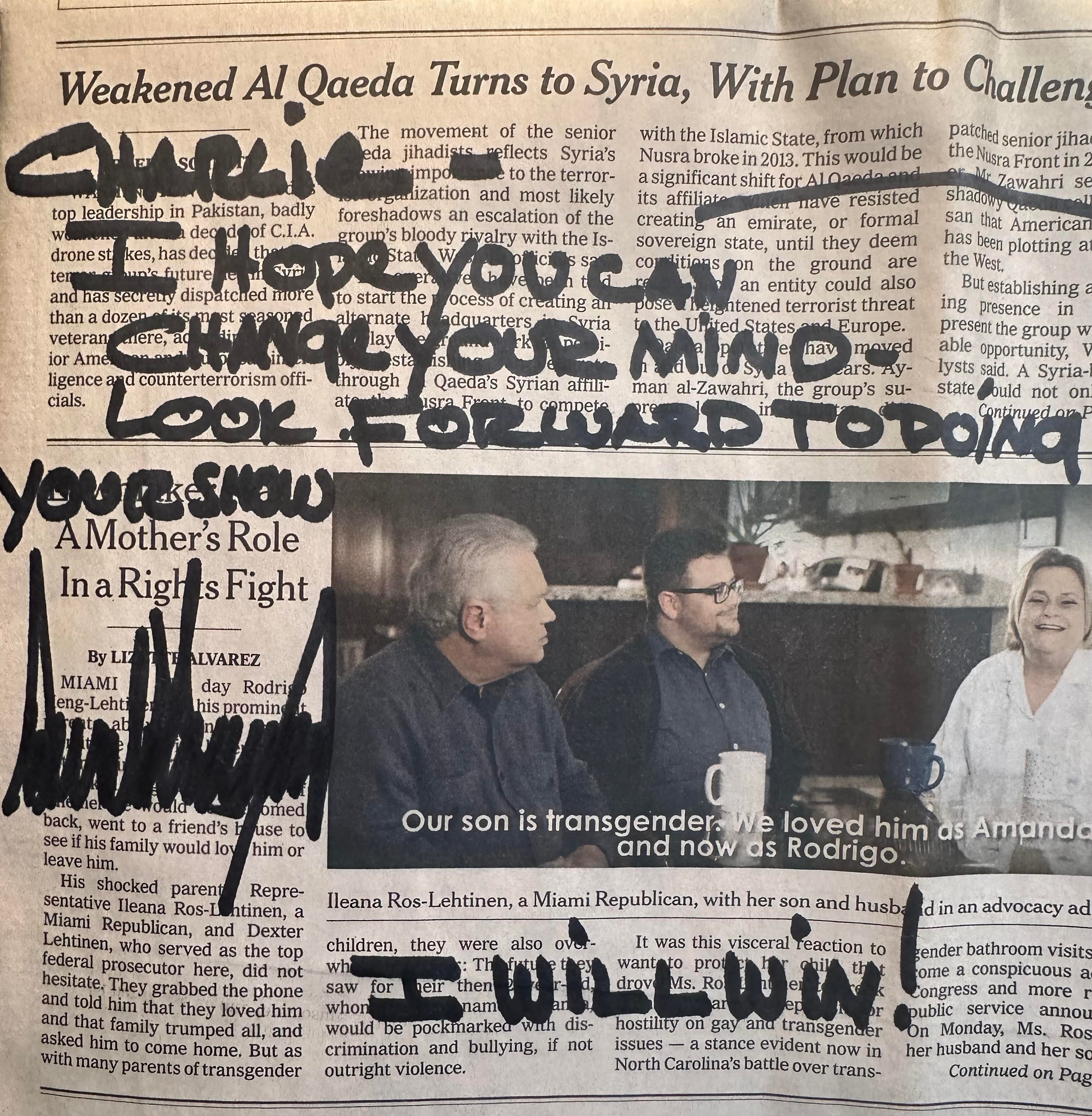 Hell, I even have my own sample — from the newspaper he sent me back in 2016: