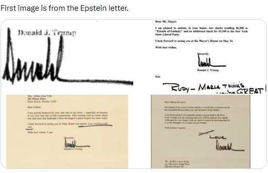 MAGA’s usual minions are still bravely in denial, eyes wide shut.1 But even the most purblind apologists see what we see, even if they are duty-bound to pretend otherwise. There is Trump’s sharpie signature — and everybody this side of Stephen Miller knows it. Aaron Blake notes that “there are a bunch of ‘Donald’ signatures from the same era that look very much like the one on the Epstein letter.”