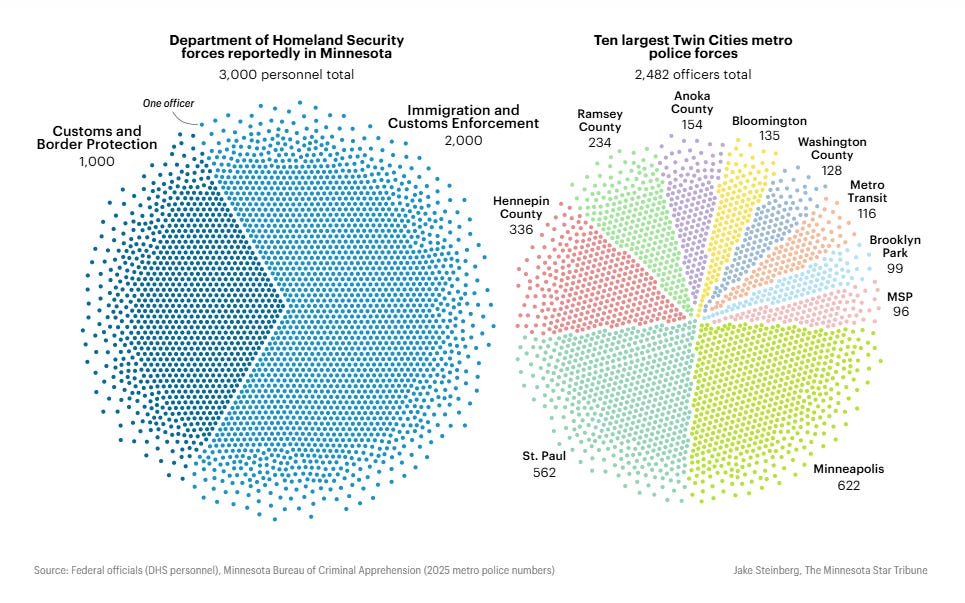 The Minnesota Star-Tribune puts this into some perspective: “A potential 3,000 federal agents from ICE and CBP is equivalent to five times the manpower of the Minneapolis Police Department.”