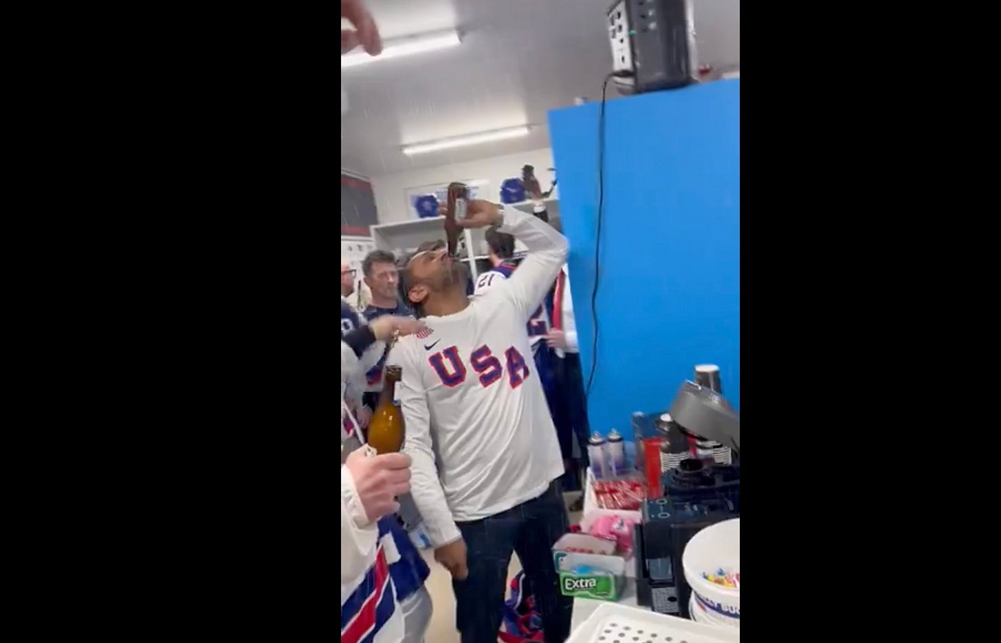 But then came the video — which rocketed around law enforcement circles —showing “Patel pouring what appeared to be beer down his throat, spraying some of it in the air and screaming in celebration as a player put a gold medal around his neck.”