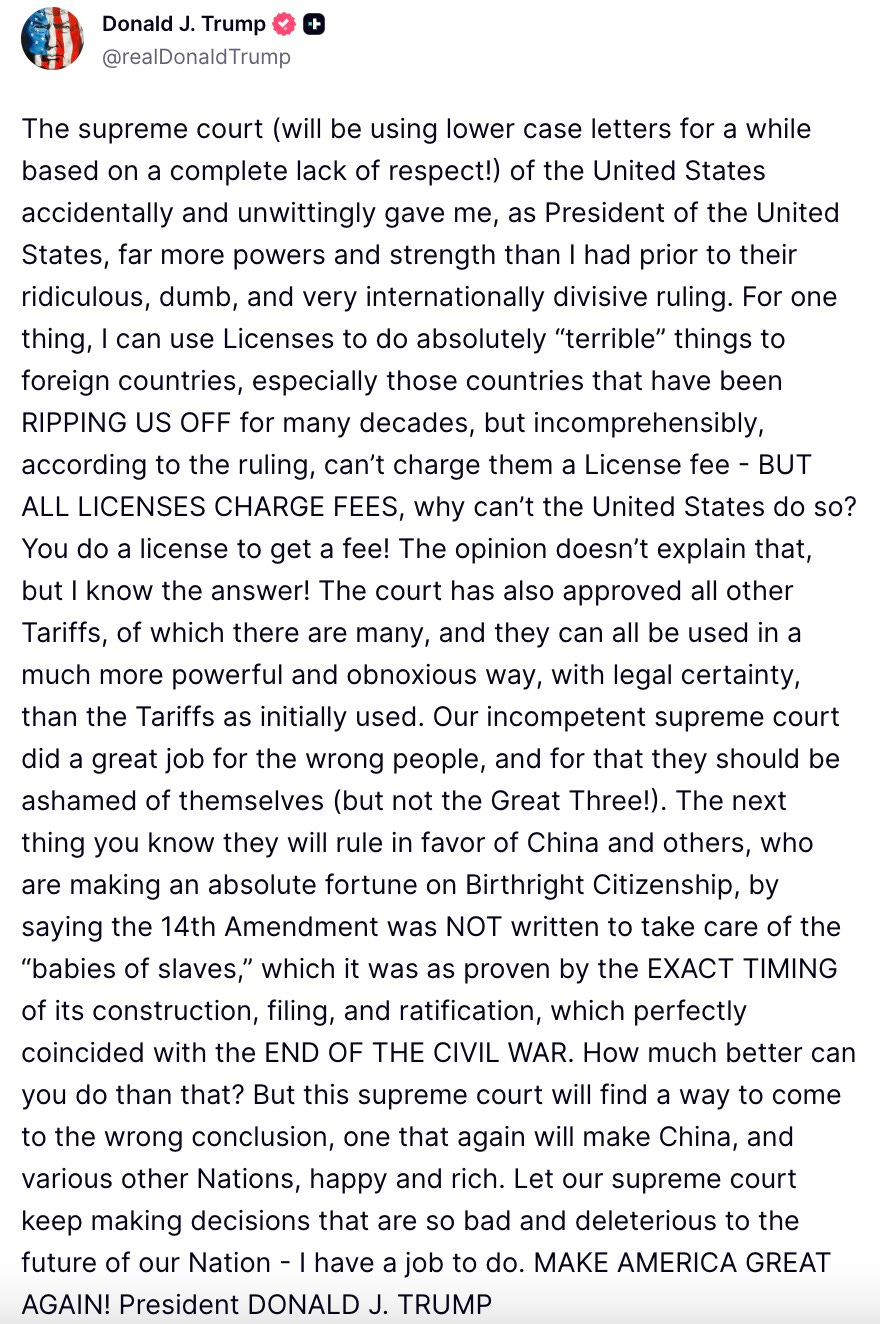 Trump continued his petulant attacks on the Supreme Court Monday morning, announcing (because he has the mental agility of an 8-year-old) that he will henceforth only spell “Supreme Court” in lower-case letters “based on a complete lack of respect!”1